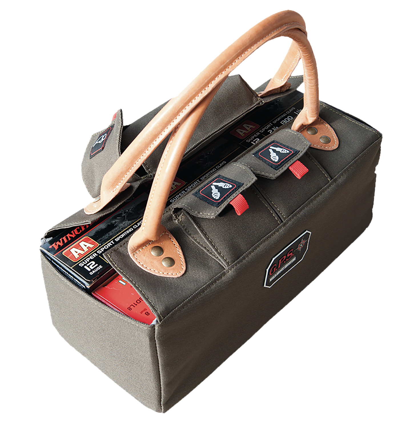 The Shotgun Shell Tote features rivet reinforced leather handles which makes it easy to carry. It holds up to 6 boxes of 12 ga shells and has a visual ID storage system.