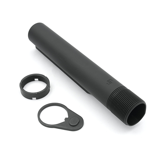 This JP-SPEC revision of the standard Mil-spec buffer tube improves on the original in both design and finish. Weve included an addition stock position (for a total of seven) and given a finer surface finish for smoother function. This design is also designed to allow extra threading into the receiver which optimizes protrusion for use with our Silent Captured Springs. – Includes buffer tube lock ring and lock plate. – Addition stock position stop compared to standard Mil-spec 6-position design – Extra fine internal finishing for smoother quieter cycling and reduced buffer component wear – High quality exterior finish for reduced buttstock friction – Allowance for further insertion into lower receiver to optimize protrusion for use with Silent Captured Springs – Fully Mil-spec compatible – COLOR: Black – LENGTH: 7.25 in. – WEIGHT: 3.9 oz. (tube only) – MATERIAL: 7075-T6 aluminum – FINISH: Hardcoat anodizing